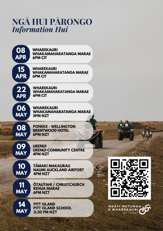 Ngāti Mutunga o Wharekauri Iwi Trust warmly invites all whānau to attend our upcoming Ngā Hui Pārongo: Settlement & PSGE Information Hui, being held online and across Aotearoa this April and May.