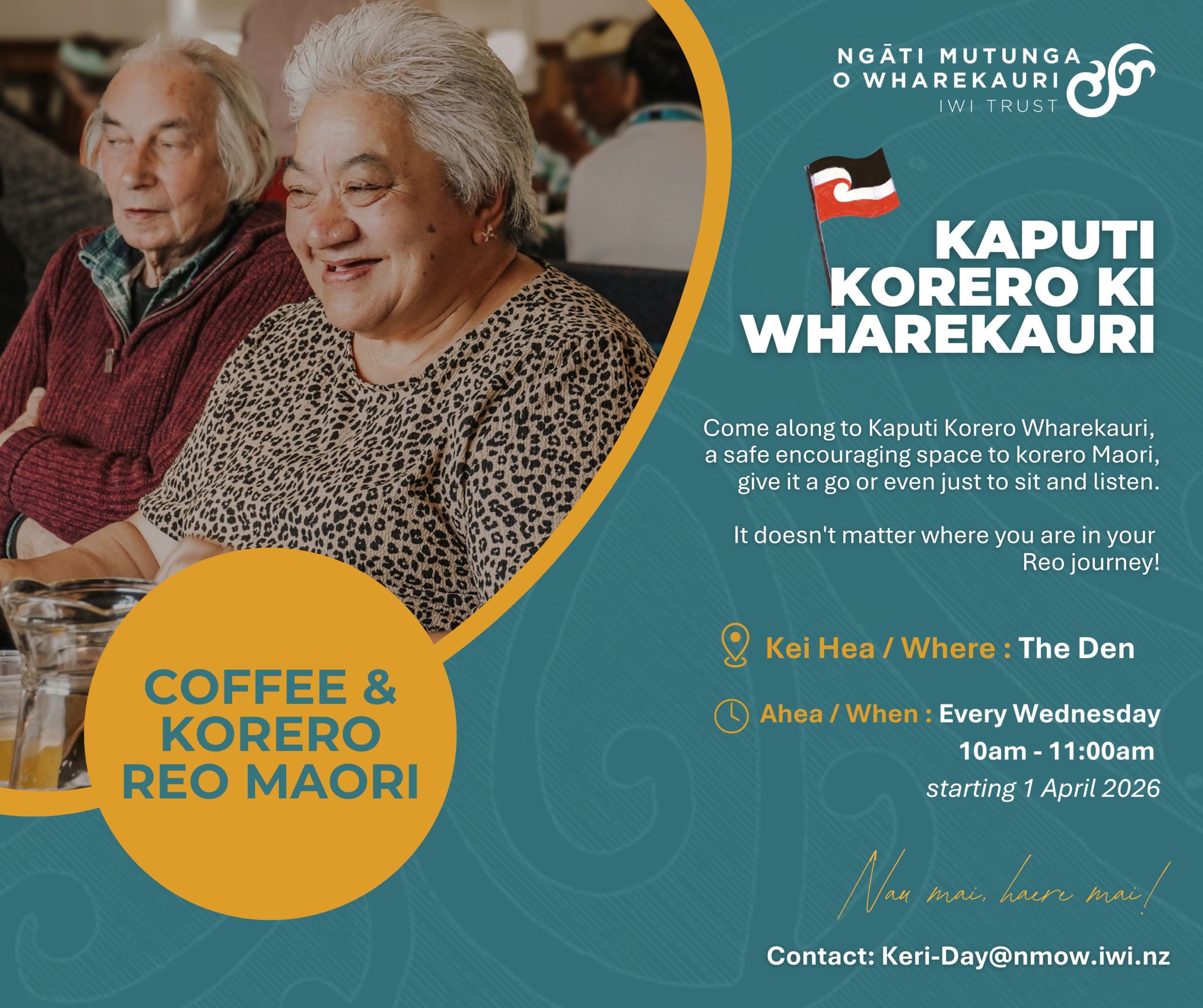 5:00 pm - 7:00 pm Waiata Wānanga April 10 @ 5:00 pm - 7:00 pm Waiata Wānanga Please bring a plate of finger food to share with our cuppa. Contact: Keri Day for more information: keri-day@nmow.iwi.nz | Office: 3050 500